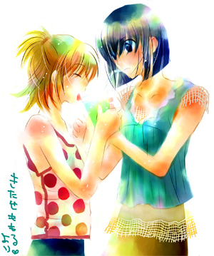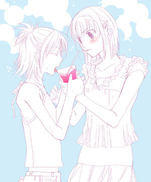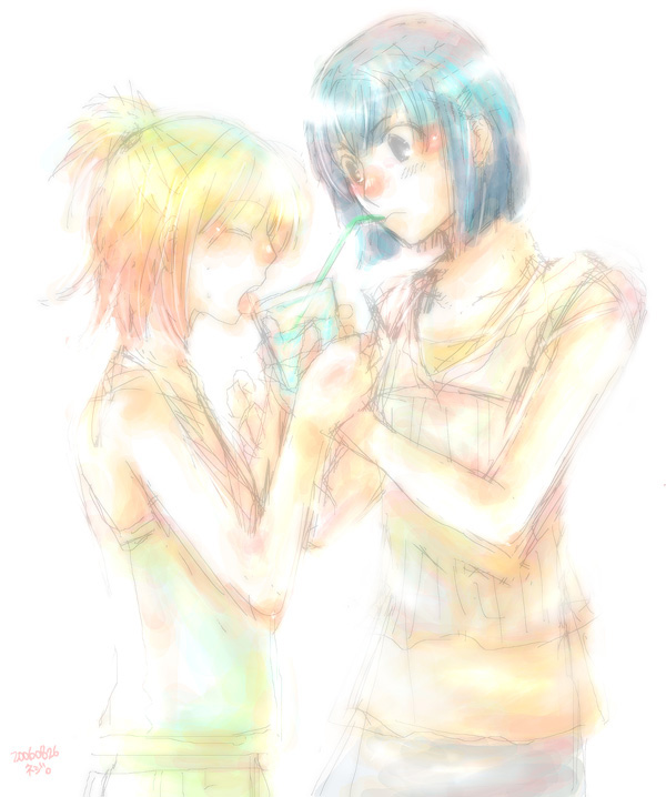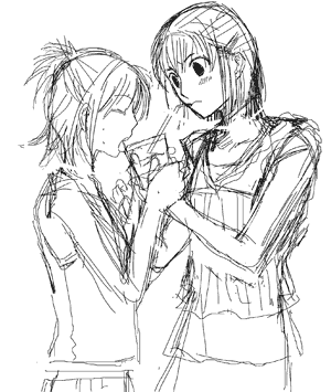 服描いてる途中で、この子(みのり)の全身資料あります?というので、何見たいのかなーと思ってたら、胸のサイズ確認してらっしゃいました(笑)。…ぺたんこですよ、多分。色塗りがほぼ完成した後、カリグラフィペンツールでざっくりと主線を入れ、ラストはPhotoshopに戻って色調補正してハイライト入れて完成。相変わらずの師匠の技量にため息でした。ちなみに途中「これはメロンフロートのアイスないヤツで」「それはメロンソーダですよ北瀬さん」という会話がありました(笑)。