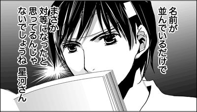 そんな訳で、キャラコンの結果がどうにもアレでむしろ居たたまれません。ホントに自分含めて星河病の奴らは空気読みませんね、場違いもいいとこな順位ですみません。しかし星河のファンはどーせこの19人でMAXですから、許してやって下さい。宮本さんのファンはこの投票数の百倍、ひつぎさんのファンは百万倍はいると信じてます。 ちなみに他キャラについては、私自分の予想と全く違う結果だったので驚いています。槙さんのトップ私かなり信じてました。槙ゆか、炎氷、風の噂により神祈。この六人とやっぱりギャグが強いずんずんと、総受け伝説綾那で上位争いかなと思ってました。夕歩強いですね。 この結果によりドラマCDがどうこうらしいですが、こうなったら私の興味は神門さんの声があの人なのかどうかの一点です、ええネタ的に(笑)。私自身は声聞いたこともないのですけども。 アレコレいいつつ、やっぱり星河さんの上位入賞は嬉しいわけで、せっかくなので「5」をお題にした小話でお祝いして〆たいと思います。お祝いにしてはあまり目出度くないお話ですが。 |